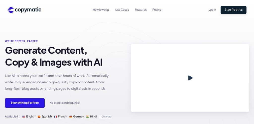 我们的AI写作助手适用于多种语言,包括英语、西班牙语、法语、德语和印地语等。您可以免费开始使用,无需提供信用卡信息。