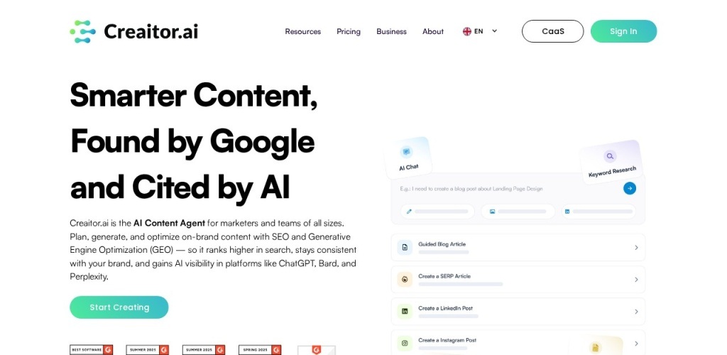- 全面的SEO工具:Creaitor提供了所有必要的SEO工具,包括关键词研究、生成集群和跟踪其随时间的性能,以及进行SERP分析以生成SEO文章并超越竞争对手。