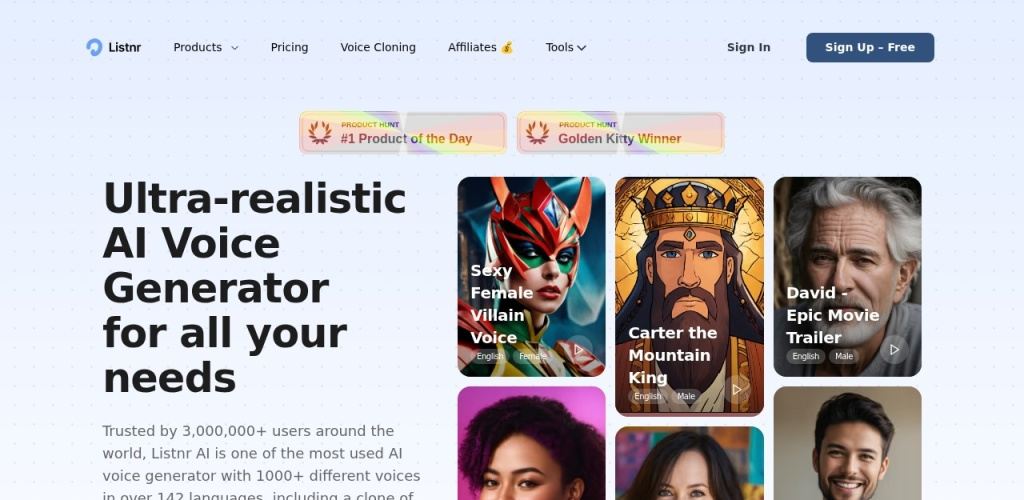 - Listnr是2023年评价最高的AI语音生成器之一,拥有900多种声音和145多种语言的资料库。