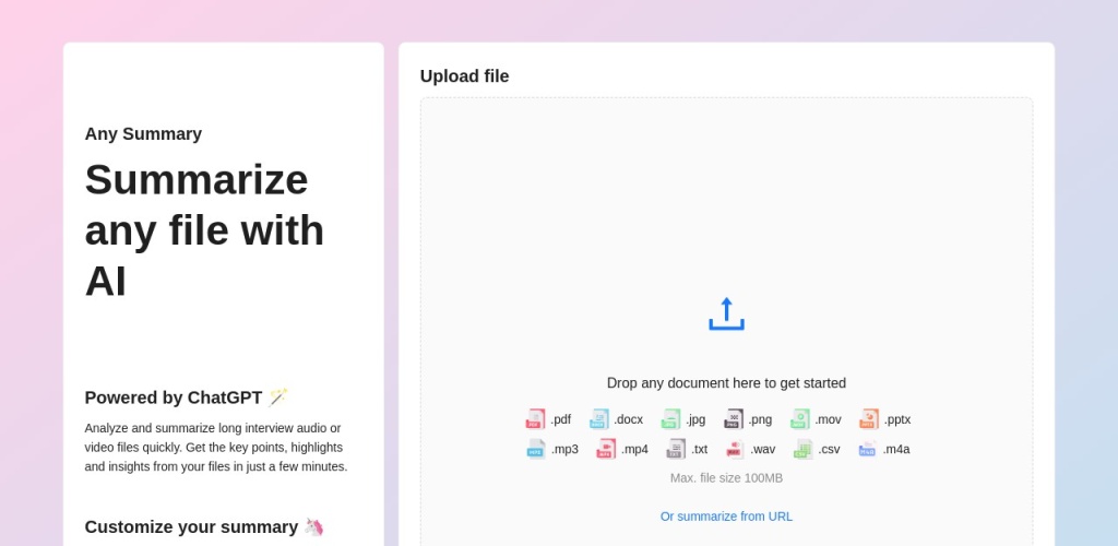 - 支持最大100MB的文件上传,适合总结较长的文档和多媒体文件