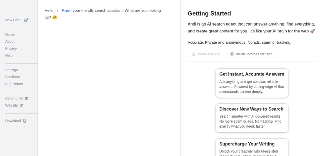 - 免费使用: Andi对消费者免费使用,没有广告和跟踪