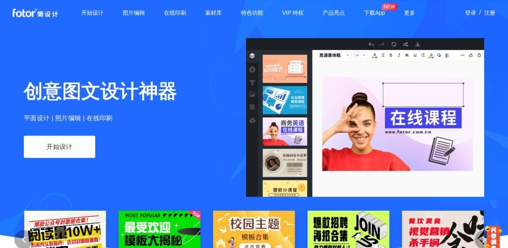 Fotor懒设计是一个在线设计神器,提供免费设计素材模板和平面设计作图软件。它的主要功能包括: