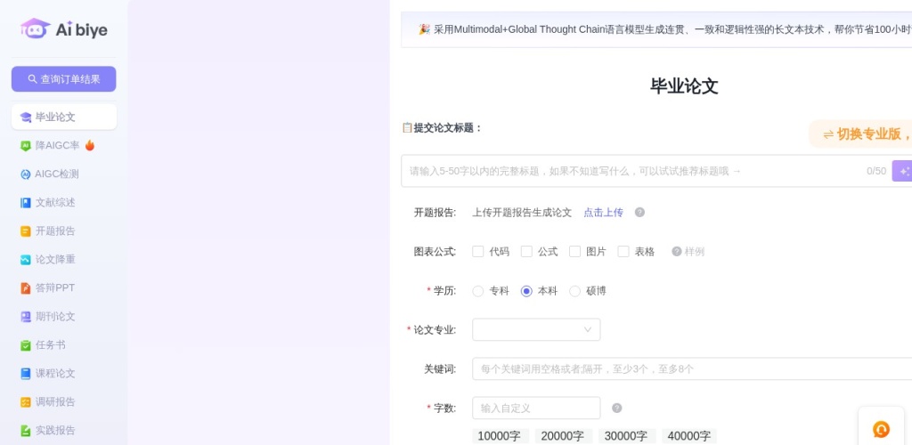 Aibiye.com是一款能够一键生成万字的AI学术辅写工具,可以自动完成开题报告、开题报告、选题大纲(免费)、论文初稿范文等。毕业阶段的任何问题,Aibiye都能统统搞定!输入写作需求,20分钟呈现高质量内容! 不同于其他交互式、拼凑式写作AI,Aibiye专门针对国内高校的论文规范和标准,基于最新ChatGPT预训练模型,结合实时文献知识库的深度洞察,不仅采用了先进的“Transformer-XL”大模型架构与“BERT-based Long-Text Understanding”长文本理解技术,还通过近5年海量真实学术数据库的精细训练,为您呈现一种革命性的学术写作体验。 这远远超越了简单的论文写作或生成,而是通过精心构建的逻辑结构和深度学术洞察,确保你的学术成果既严谨又具有前所未有的深度。 Aibiye致力于全面简化你的写作流程,让你能够更专注于学术探索,充分释放学术潜能!