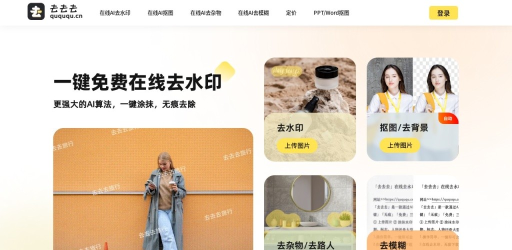 答:在去去去中,用户只需上传图片,涂抹满屏水印区域,点击处理按钮,即可去除满屏水印。