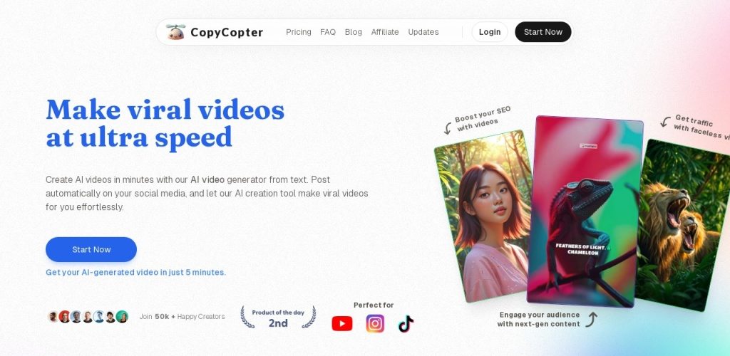 高效转换:CopyCopter能在短短5分钟内将长文本内容转换为短视频,相较于传统的人工剪辑方式,效率提高了25倍。