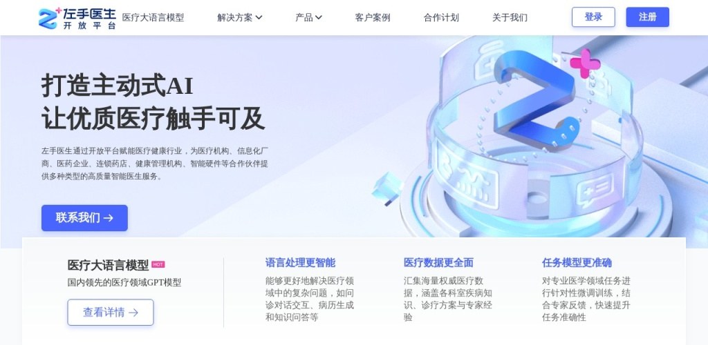 左手医生开放平台是基于人工智能技术开发的医疗健康服务平台。它结合了大数据分析和机器学习算法,为医疗机构、信息化厂商等合作伙伴提供国内领先的医疗大语言模型、智能产品和专业技术支持。通过这些技术手段,左手医生开放平台能够构建医患主动沟通的智慧医疗服务体系,提升医疗服务效率,优化患者体验。