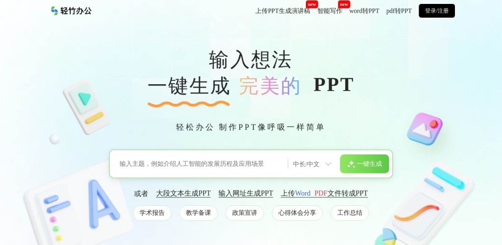 AI一键生成内容:轻竹AI可以根据用户输入的关键词或主题,自动生成结构清晰、内容丰富的PPT。这大大节省了用户的时间和精力,提高了工作效率。