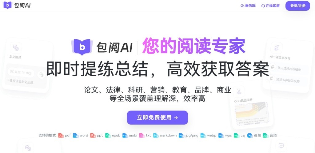 多格式兼容:包阅AI支持PDF、docx、图片、网页等多种格式,满足用户在不同场景下的阅读需求。