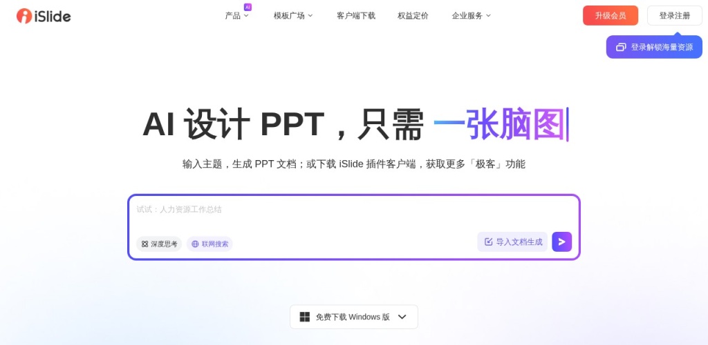 iSlide是一款基于人工智能技术的PPT设计工具,它结合了深度学习、自然语言处理等技术,为用户提供智能化的设计建议。通过分析用户的需求和行为,iSlide能够为用户推荐合适的模板、图示、图表等元素,帮助用户快速完成专业的PPT设计。