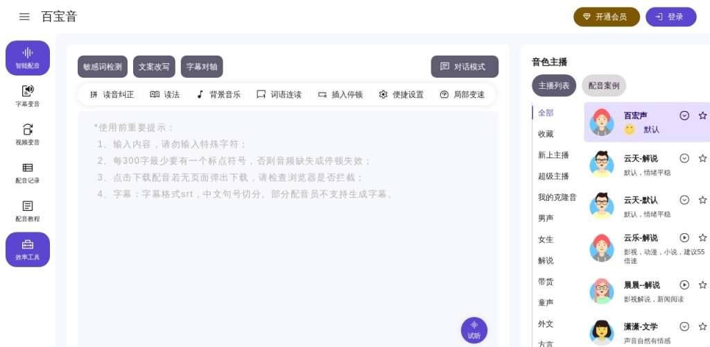 丰富的功能支持:除了基本文字转语音功能外,百宝音还提供背景音乐、音色调节、文案改写、字幕对轴等多种辅助功能,让配音过程更加便捷、高效。