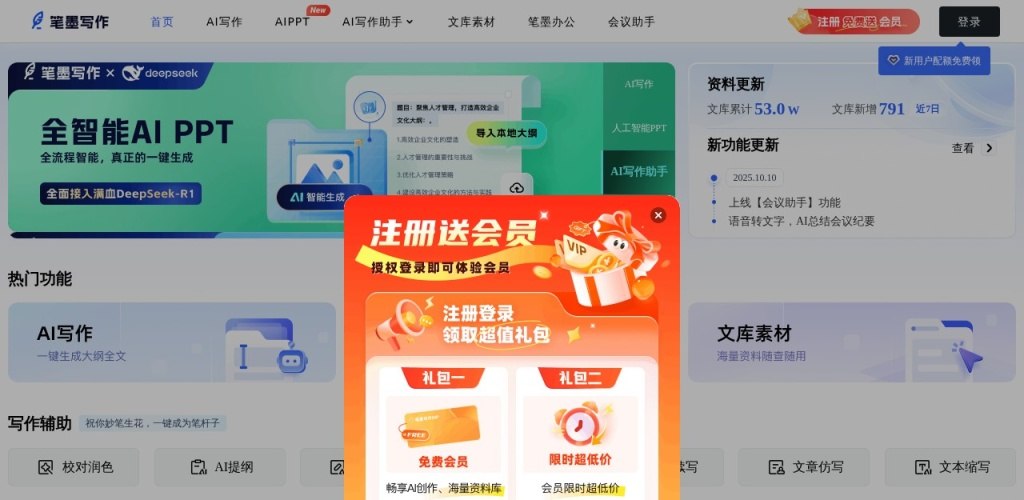 分为免费和会员权益。可以免费使用笔墨宝典中的笔墨文库、灵感素材、PPT模版、展板模版、公文模版,以及笔墨办公的所有功能;会员权益为AI写作、AI提纲、AI校对润色