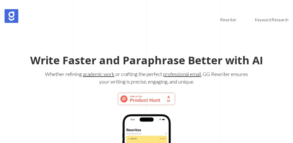 GG Rewriter利用人工智能的能力,确保您的写作准确、引人入胜、独特。它可以帮助您提高学术作品的质量,撰写完美的专业电子邮件。