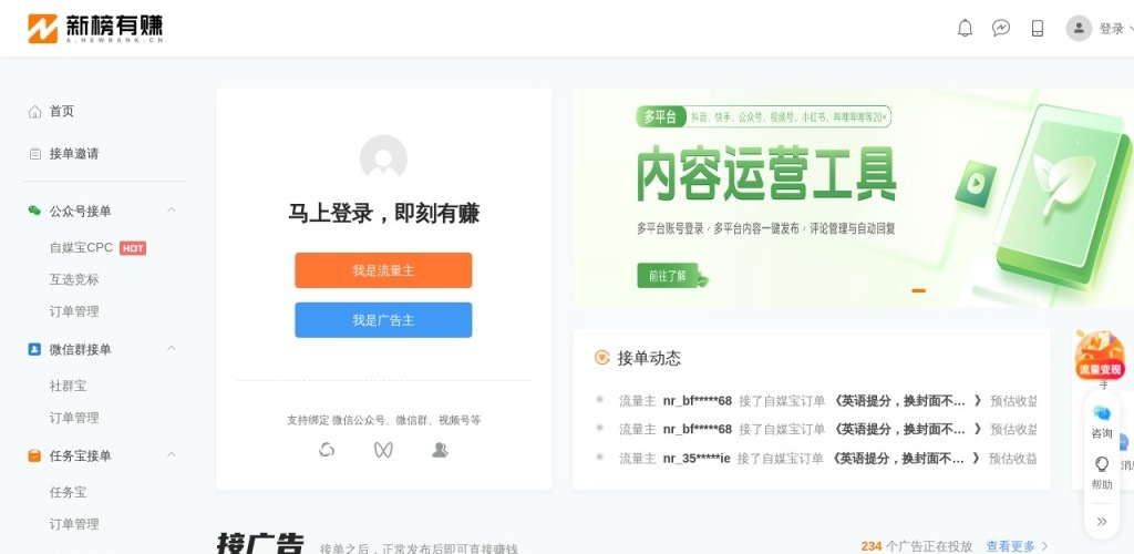 新榜有赚通过线上系统和多款内容营销投放接单工具,如“自媒宝”、“互选宝”等,提供流量募集与分发服务。