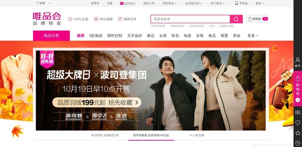 唯品会-【品牌特卖】你想要的品牌,你喜欢的价格!精选品牌+深度折扣+限时抢购!涵盖名品服饰鞋包、美妆、母婴、居家、生活等全品类名品。每天准点上线数百个正品品牌特卖,为消费者提供超值的购物惊喜!正品保证,7天无理由放心退!近2000人专业客服团队为消费者提供专业服务!