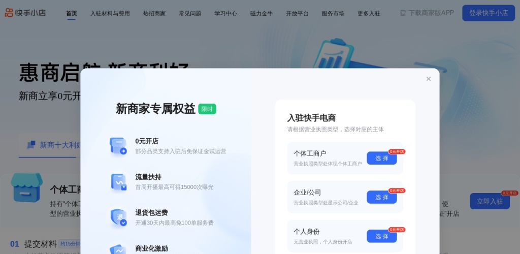 操作:在快手App中选择“我要开店”,然后选择入驻类型。