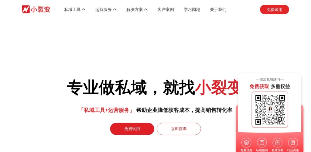 小裂变提供零售、电商、教育、美业、金融等全行业私域运营解决方案,帮助企业搭建全渠道引流获客、运营留存、成交转化、客户管理于一体的数字化私域营销闭环,带动业务低成本、高效率、指数级增长。