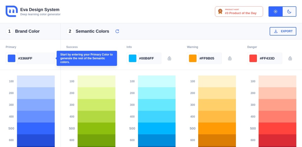 Eva Design System是一个基于深度学习的配色网站,旨在帮助用户为其产品或品牌生成系统性的配色方案。该工具不仅提供了多种颜色搭配建议,还允许用户实时调整和导出自己的配色方案。Eva Design System的核心功能包括主颜色自动配色、颜色加深/淡化调整以及多种格式导出等。
