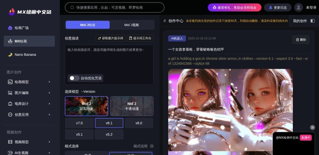 Midjourney中文站(MJCN)基于先进的人工智能技术,为用户提供一站式的绘画创作体验。从文本或语音指令到各种风格的艺术作品,MJCN展现了出色的创造力和理解力。