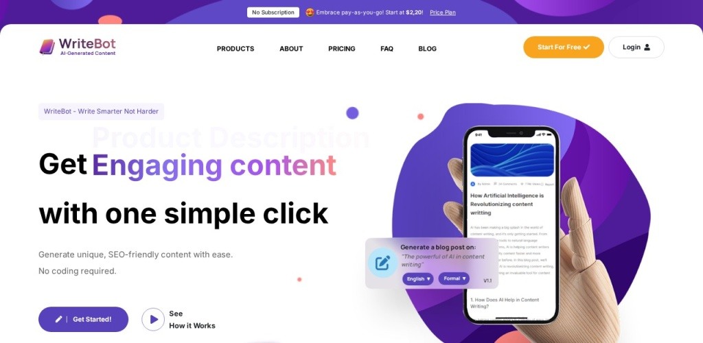 答:WriteBot能够生成独特、符合SEO标准的内容,特别适合生产博客文章、Facebook广告和产品描述等。