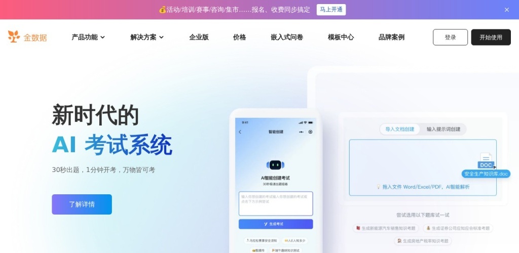 答:金数据平台的考试功能具有AI智能加持,可以快速发起专业考试,轻松管理和分析考试结果。