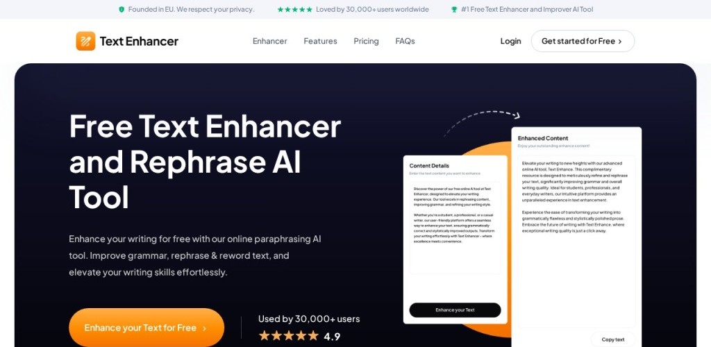 目前,已有超过30,000名用户在使用Text Enhancer AI,并给出了4.9的高分评价。它已经成为众多用户心目中的最佳文本增强AI工具。