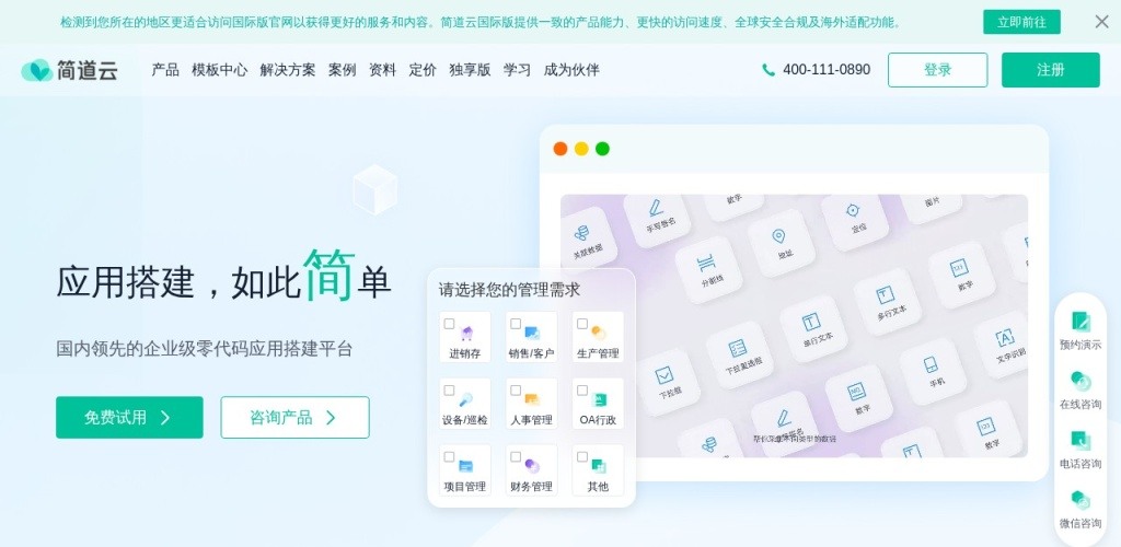 简道云是零代码的应用搭建平台,可以帮助各行业人员在不使用代码的情况下搭建个性化的CRM、ERP、OA、项目管理、进销存等系统,产品包含自定义表单、自定义报表、自定义流程引擎、知识库、团队协作等功能,适用于各种业务场景。