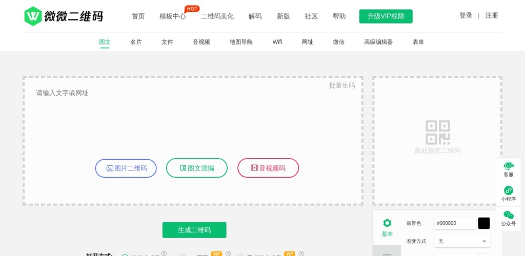 微微二维码是专业二维码制作服务商,提供视频音频二维码生成、图片文件二维码制作、二维码表单登记系统、二维码管理系统,广泛应用于:产品宣传、企业展示、旅游、教育培训、建筑施工、生产制造、医疗卫生等领域。