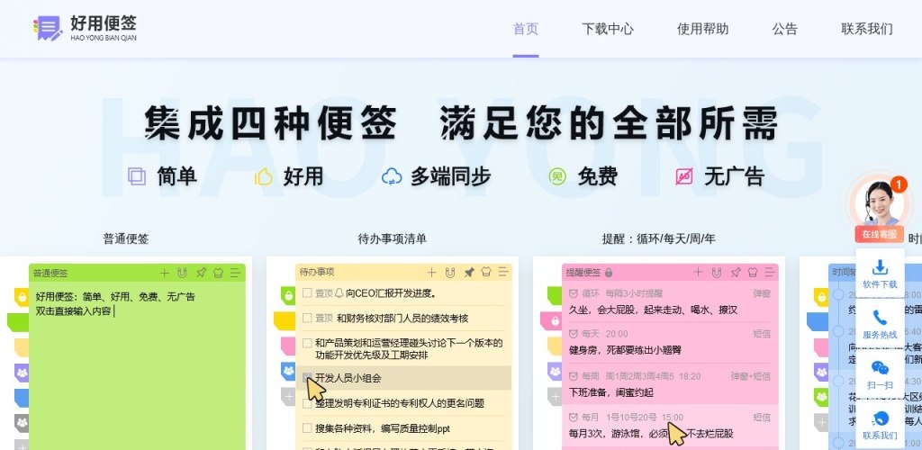 好用便签是一款简单易用免费无广告的电脑桌面便签软件工具,电脑端手机端云同步,贴边自动隐藏,一键加密,用于记录笔记、待办事项、任务清单、日程提醒、短信提醒等,支持团队多人共享。